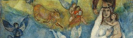 De niño Moishe Shagall se subía al tejado de su casa, en Vitebsk, para ver las estrellas, y todo le sublimaba: las vacas que desollaba su tío, su otro tío que malamente -como el propio pintor- tocaba el violín, el río, los caballos, el paseo en carreta y los paisajes, los edificios, los ritos hebreos. Así creará para su arte una nueva naturaleza de leyes y fusiones fantásticas, la vida se eleva, flota, es la poesía hecha pintura. La realidad trascendida, y el ensueño, y la felicidad, todos son una realidad para Chagall: las flores, el azul, el gallo y la cabra, el rojo, y Bella, el amor, los abrazos, el beso, el cuerpo femenino. Todo es cálido en Chagall, su pintura es el amor. También sorprende en los temas cristianos, y el Hijo Pródigo… y la guerra.